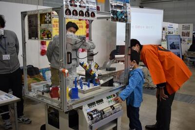 | 今回は、シナジーシステム(株)様の協力で 産業用ロボットの展示をしていただいたのですが、 鹿本商工高校にも同じ実習ロボットがありますので、 電子機械科の生徒たちはこの高価な装置を使った 勉強をしています。プログラム次第でコーヒーを 注ぐ動作をさせるなど、様々な動作をさせることが できます。 |