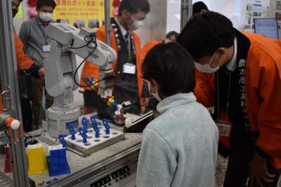 | 操作方法は高校生が優しく教えてくれるし、 どんなに乱暴な操作をしても床や壁に当たらないような リミットがかかるプログラムが組んであるので安心です。 そのようなプログラミングの技術も鹿本商工で 習得することができます。 |