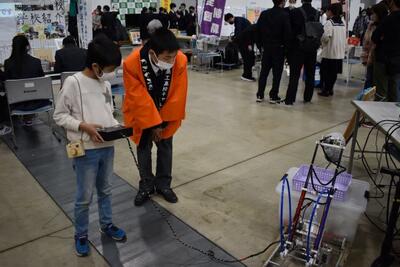 | こちらはリモコン操縦ロボット体験です。 高校生が製作したロボットを操縦して、 コアラのぬいぐるみを上手につかんで カゴに入れるまでを体験します。 皆、やり方を少し教えるだけで すぐに上手に操縦していました。 |