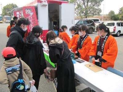 令和5年1月10日(火)午後1時より、ミスターマックス山鹿店駐車場内において山鹿警察署員の方々と本校生徒8名(機械科3年生3名、電子機械科3年生5名)が協力し、山鹿市の商業施設を訪れる市民を対象として、DJポリスによる110番通報の適切な利用を求める呼びかけや広報啓発用のチラシ・グッズ配布を行い、110番通報制度に対する正しい認識の定着化を図るキャンペーンを実施しました。