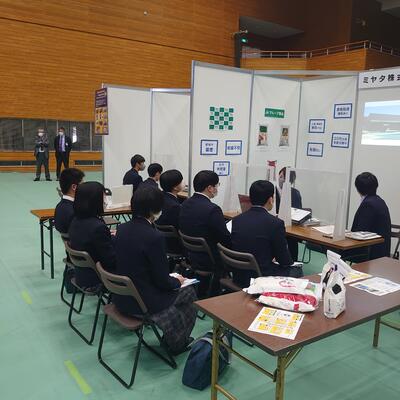 3年生が課題研究という授業の中で1年間研究してきたことをまとめ、1・2年生を前に発表しました。この授業では、これまでの学習で身に付けた知識・技術などを基に商業や工業に関する課題を発見し、解決策を探求して創造的に解決することにより、職業人として必要な資質・能力を育成することを目的としています。