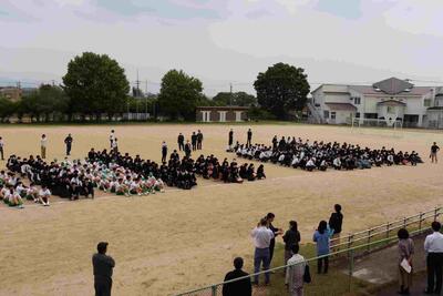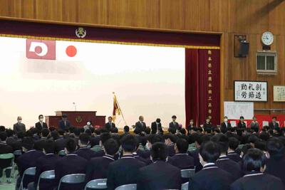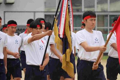 5月24日、6限目に熊本県高等学校総合体育大会・総合文化祭、全国高等学校ビジネス計算競技大会熊本県予選、ものづくりコンテスト推戴式が実施され、大会に出場する選手の一致団結と競技における健闘を期して、全校生徒がエールを送りました。後迫教頭先生のあいさつの後、旗手に校旗を渡し、選手宣誓がなされました。