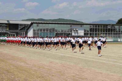6日目は、閉会式のリハーサルから始まりました。表彰も優勝がどちらの団でもよいように、リハーサルを行いました。また、音楽部の演奏で校歌斉唱もおこないました。その後は集団演技の練習もおこないました。練習を開始した時よりも、商工体操もダンスも素晴らしい演技に仕上がっています。その後各団での応援や競技の練習が実施されました。