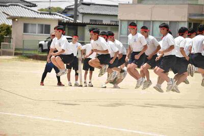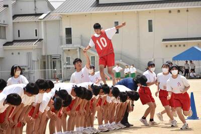 次は2年の学年競技、「人間渡り橋」。バランスを上手くとりながら、みんなの背中でできた橋を渡っていましたし、橋になるみなさんも急いで移動をして、新たな橋を架けていました。担任の先生が参加されたチームもありました。