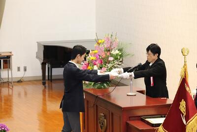 表彰式では、第48回全国高等学校総合文化祭「かがわ総文」弁論部門で優秀賞を受賞した情報管理科2年の茂見さんが表彰を受けました。