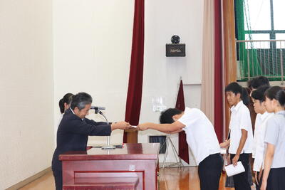 その後の終業式では、後迫教頭先生が藤本校長先生の式辞を代読され、一学期の反省と二学期に向けての心構えを話されました。その他先生方から、進路や夏休みの過ごし方、健康面などについてお話がありました。