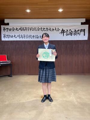 12月9日(土)に行われた、第7回全九州高等学校総合文化祭大分大会弁論部門(第73回九州高等学校弁論大会)で、電子機械科1年 黒木さやか さんが優良賞を受賞しました。