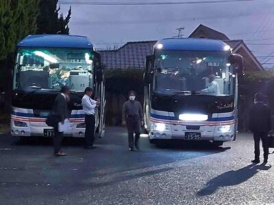 学校から福岡空港までは2台のバスで移動します。バスの乗車が完了し、いよいよ出発です。