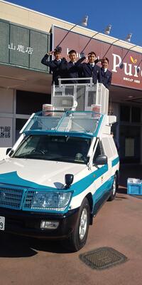令和5年1月10日(火)午後1時より、ミスターマックス山鹿店駐車場内において山鹿警察署員の方々と本校生徒8名(機械科3年生3名、電子機械科3年生5名)が協力し、山鹿市の商業施設を訪れる市民を対象として、DJポリスによる110番通報の適切な利用を求める呼びかけや広報啓発用のチラシ・グッズ配布を行い、110番通報制度に対する正しい認識の定着化を図るキャンペーンを実施しました。