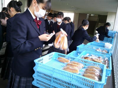 取扱商品は、クロワッサン・カレーパン・塩パン・きな粉揚げパン・焼きそばパン・グラタンパン・チョココロネ・ホットドッグ・マリトッツォの9品で、「焼き立てパンの元」様(菊池市泗水町)の御協力を得て実施しました。売れ筋は、きな粉揚げパンで100個以上を売り上げました。取扱数量も453個、全校生徒数の1.5倍になりました。生徒たちは、お気に入りのパンを手にして笑みに包まれていました。