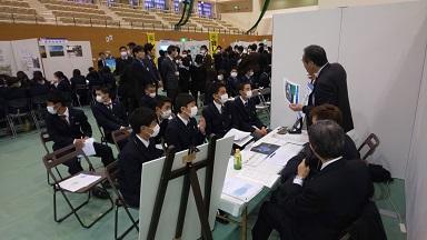 1年間通して「課題研究」の授業の中で、自分たちが取り組んできた内容を発表する場です。各班とも工夫を凝らして、成果を発表しました。1,2年生も参観し、来年、再来年に取り組みたい研究テーマについて考えを巡らせていました。