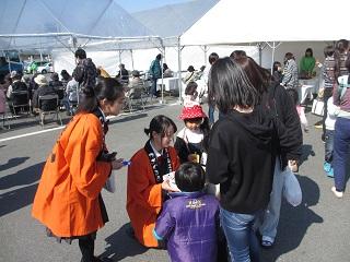 マーケティング部では、菊池川流域が2000年前から「米づくり」を支えてきたということから、山鹿産の米粉を使用した『鹿本商工ら(カモトショコラ)』の販売をしました。初めてのイベントで販売数の予想が難しかったのですが、ステージでのPR効果もあり、準備した150個があっという間に完売しました。他にも山鹿の観光名所を飴にした『山鹿めぐり』や復興支援の寄付金付きの『くまモンクリアファイル』を販売し、生徒の共同開発商品をみなさんにお買い上げいただき、菊池川流域のたからもの発見に貢献することができました。