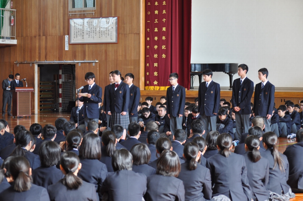 平成30年4月10日(火)、対面式が行われました。1年生は初めて2、3年生と顔を合わせました。各科の先輩方から1年生へ科の紹介があり、1年生からは抱負が語られました。これから3学年全員で、体育大会等の学校行事に積極的に取り組んでいきましょう。
