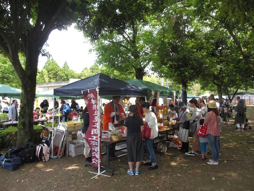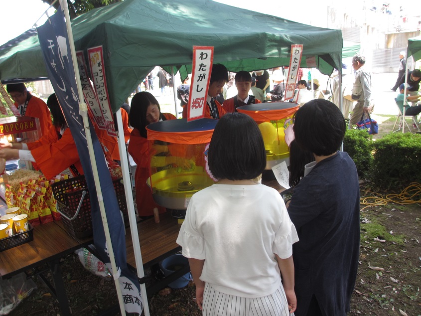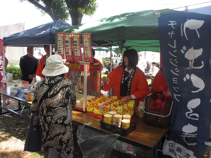 当日は天候に恵まれ、「こどもの日」ということもあり、たくさんの家族連れのお客様が来場されました。 生徒たちは、本校の共同開発商品『鹿本商工ら』(クラシックショコラ)と『ちょこ福』(チョコ大福)、フェアトレード産品(チョコレート、コーヒー、ココア等)、そして毎回大人気の綿菓子、ポップコーンを手際よく販売し、一部のフェアトレード産品を残して完売することができました。