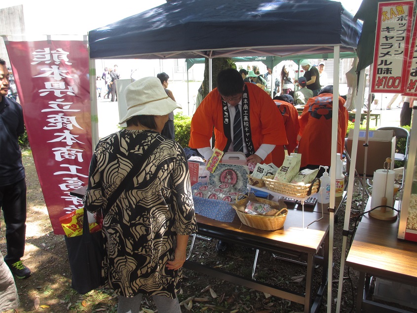 また『山鹿めぐり』(生徒共同開発の金太郎飴)のサンプルを配布し、鹿本商工高校の活動を伝える良い機会とすることができました。綿菓子の機械が動かなくなるハプニングもありましたが、担当枠を越えて協力し、チームワークで乗り切りました。今後も笑顔で頑張ります!