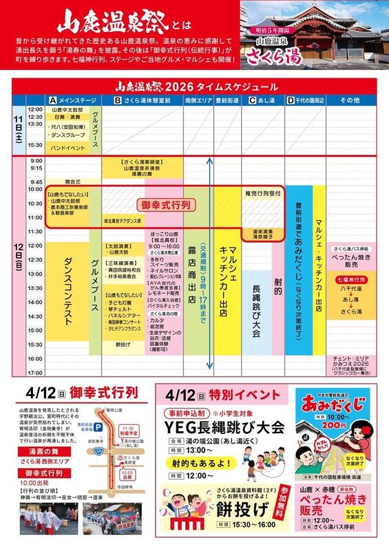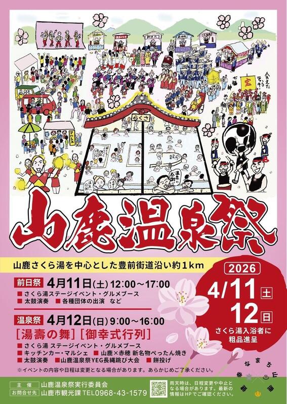 山鹿温泉祭は、湯のまち山鹿の歴史や文化を感じることができる、地域を代表する春のイベントです。さくら湯周辺を中心に、ステージイベントや各種催しが行われ、多くの来場者で賑わいます。
