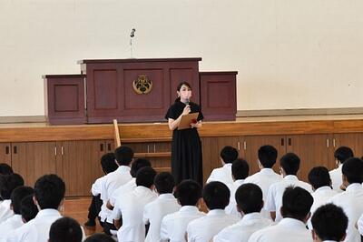 令和3年7月21日(水)、表彰式の後に終業式を行いました。新型コロナウイルス感染症の影響でこれまでは放送による終業式や始業式が続きましたが、感染症対策を万全にし、体育館に集合して久しぶりに終業式を行うことができました。