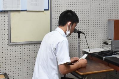 推戴式では、校長先生からのお言葉があり、バレーボール部主将の松山くんが選手宣誓を行いました。その後、大会に出場する各部門の代表が意気込みを述べ、最後に生徒を代表して生徒会副会長の松岡さんが激励の言葉を送りました。どの出場者の言葉からも、大会に懸ける想いがひしひしと伝わってきました。