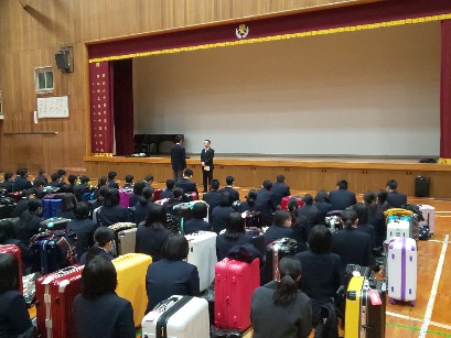 2年生修学旅行 投稿日時 : 2018/12/11 学校サイト管理者 今日から2年生が3泊4日で修学旅行に出発しました。出発式で宇野木くんが「校訓のもと行動して頑張ります。」と決意表明しました。多くの職員に見送られながら、6時半に出発しました。 現在、羽田空港に定刻より少し遅れて到着したところです。東京に着いて、すぐに長野へ移動しています。