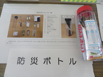 図書館前には防災主任の原口先生と協同して、熊本地震コーナーを作りました。熊本地震に関する本や、原口先生の「防災ボトル」も展示しています。「防災ボトル」とは、500㎖のペットボトルに自分に必要なものを常備して、災害に備える方法の一つです。
