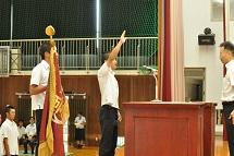 学校長から激励の言葉をいただき、副主将の竹村くん(M3)が校旗を授与しました。主将の牧田くん(D3)が「最後まで諦めず自分たちのプレーをする」ことを宣誓しました。生徒代表の高田くんから「みんなで応援しています。最後まで頑張ってください。」と激励の言葉を贈りました。