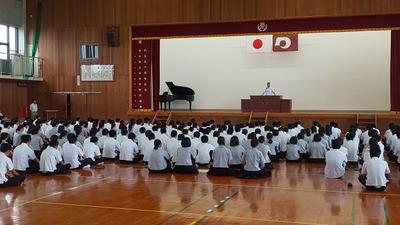 表彰式の後に終業式を行いました。校長先生の講話では、表彰が多くよく頑張った学期でしたと労いの言葉がありました。その後、言霊(ことだま)について話があり、相手を卑下する、人格を否定するようなことは言ってはいけない、相手を思いやる内容を言葉にのせましょうと話されました。SNSやインターネットでの書き込みも同じです。言葉を発する前に、書き込む前に、一呼吸置くことが大切だと思います。