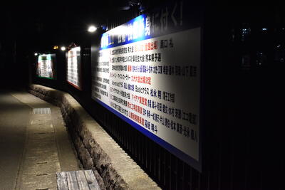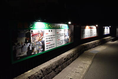 本校の正門付近に4科(商業科・情報管理科・機械科・電子機械科)の紹介や就職状況、資格取得、表彰関係を掲げた看板(写真①~③)があります。しかし、その付近は、日が暮れると真っ暗となり、安全上でも不安があるところでした。そこで、それらの看板をライトアップさせることで、本校の魅力を昼夜問わず、いつでも発信させることができると共に、暗闇を照らす意味でも本校生徒を含め、地域の方々の安心・安全を確保する目的で計画しました。