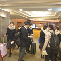 スキーウェアに身を包み、ワクワクしながらロビーに集合中!
