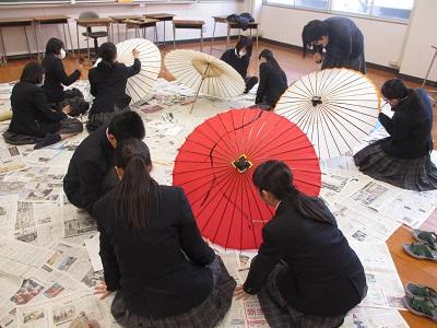 山鹿灯籠浪漫・百華百彩に向けて、商業科3年生徒を中心に、和傘の製作に取り組みました。慣れない作業のため、完成までにはたくさんの失敗がありましたが、なんとか完成させることができました。生徒たちは和傘の製作をとおして、山鹿の地域活性化に少しでも貢献できたのではないかと思います。