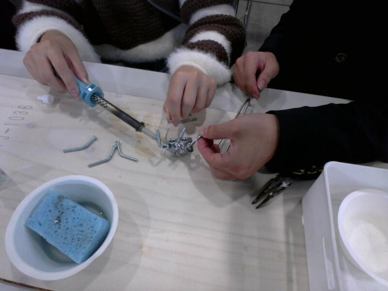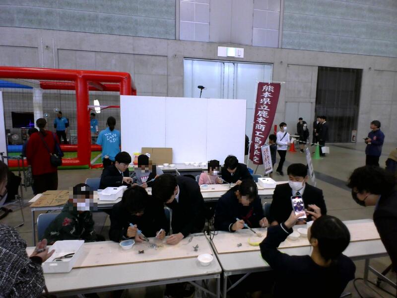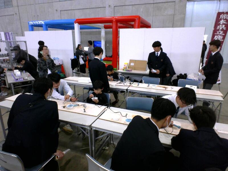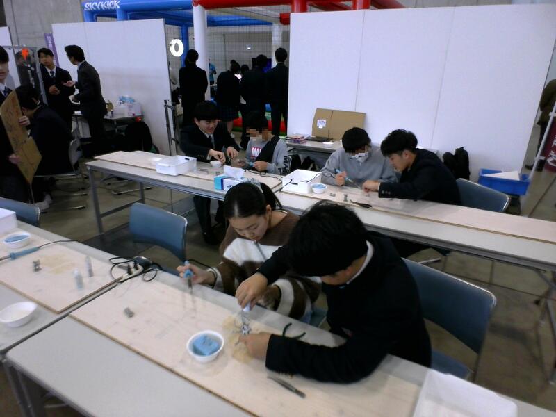 中学生ものづくり教室、商工フェスタ、門前市に続く4回目ということで本校生徒たちは慣れた手つきで体験に来ていただいた来場者の補助を行っていました。