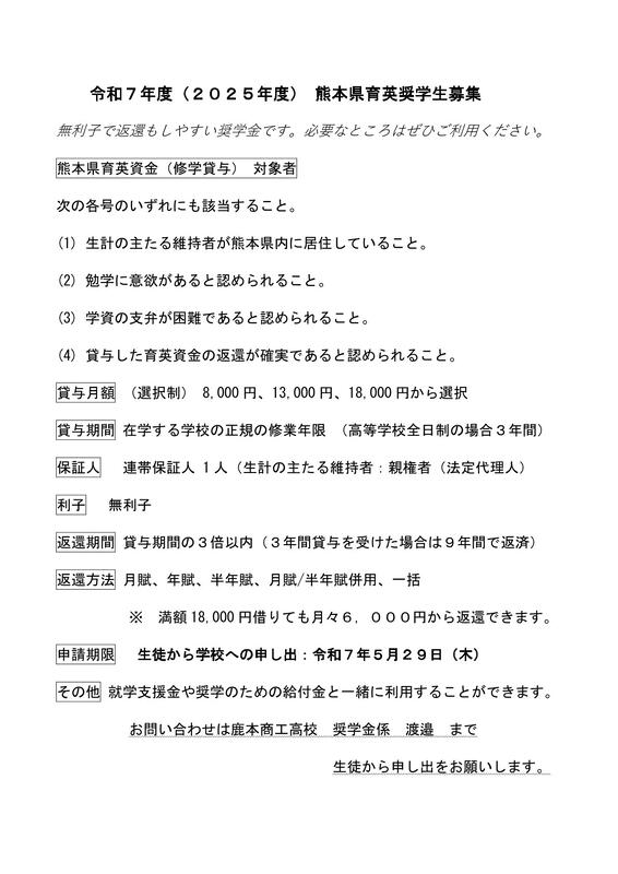 ・令和7年度 熊本県育英資金募集のお知らせ(5/12)