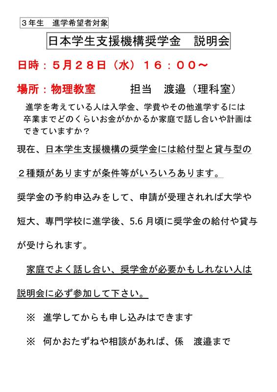 進学してからの予約奨学金についての説明会を実施します。説明を聞いておく必要があるかどうか家庭でも話して、参加してください。