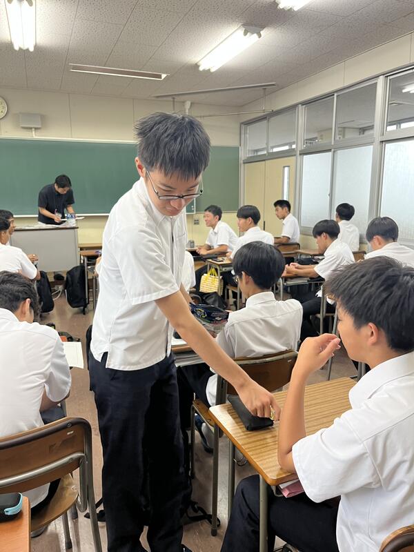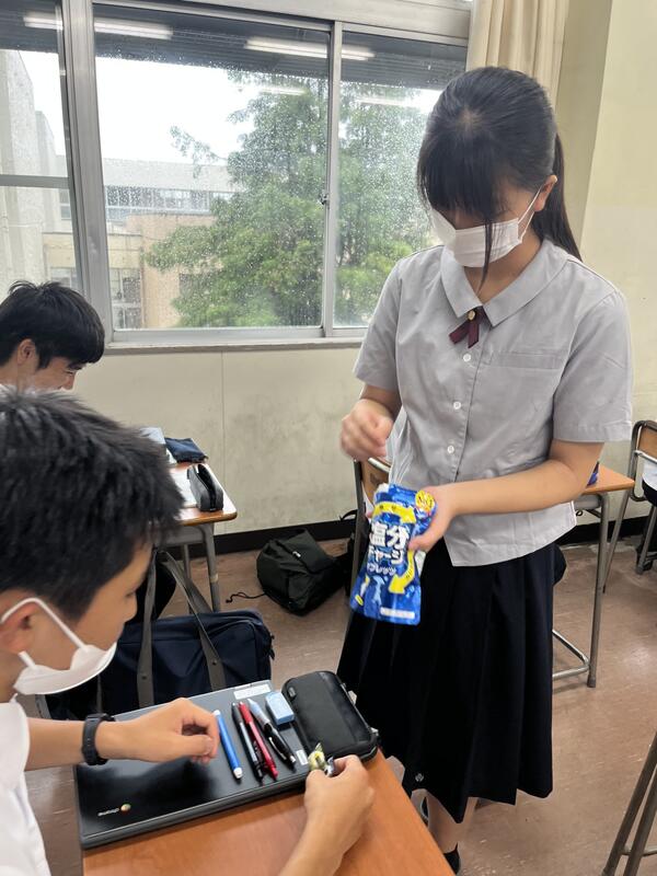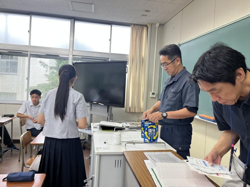 蒸し暑い日が続いています。工業実習棟での授業における熱中症対策として、機械科と電子機械科に塩タブレットを配付しました。生徒たちは、科の先生や養護教諭から塩タブレット摂取や水分補給等について指導を受けました。
