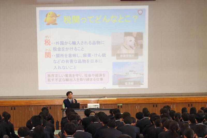11月19日(水)に薬物乱用防止講演会を行いました。今年度は、長崎税関三池税関支署の菊池様はじめ長崎税関監視部麻薬探知犬管理センターの方々を講師に迎え、「薬物乱用防止について~不正薬物の水際取締り~」をテーマに御講演頂きました。