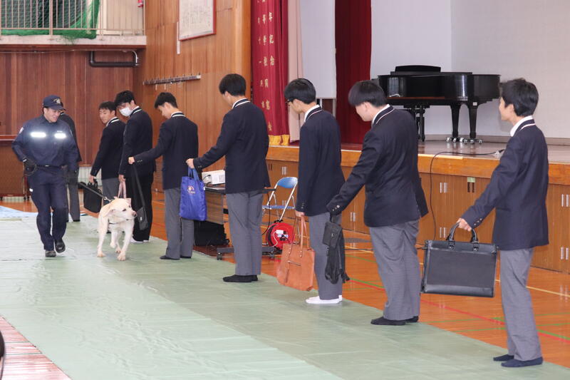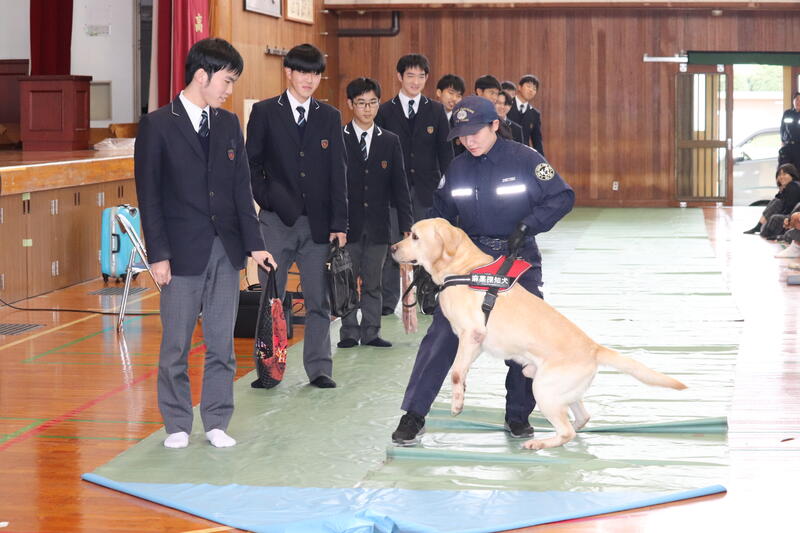 講演では、税関の役割や取締りをされている不正薬物について、分かりやすくお話頂きました。また、生徒参加型の麻薬探知犬のデモンストレーションでは、驚異的な嗅覚での麻薬探知の実際や遊びを通じた訓練方法、ハンドラーとの強い信頼関係等について楽しく学ぶことができました。