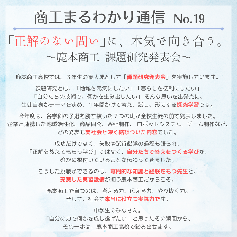 「正解のない問い」に、本気で向き合う。~鹿本商工 課題研究発表会~