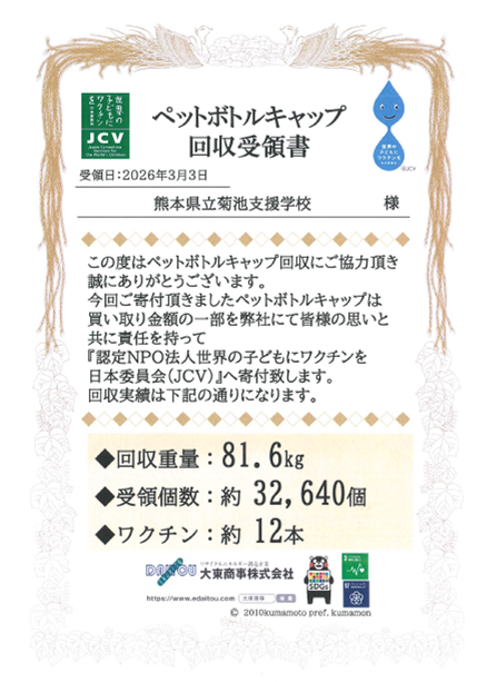 先日、校内で集めたペットボトルキャップ70kg(約28,000個)を業者の方に引き取っていただきました。