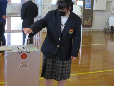 どうして選挙が必要なのかや、投票の方法などについて講話をしていただきました。選挙クイズの時に、「投票日に予定が重なり、投票に行くことができません。どうしたら投票できるでしょう?」という質問に、生徒たちは真剣に質問の答えを考え発表することができました。そして講話の後には体育館に設営された投開票所にて、模擬選挙を体験しました。投票立会人や名簿対照係、投票用紙交付係など、色々な係となった生徒たちも、係の仕事を最後までやり遂げることができました。緊張している様子もありましたが、投票する時のマナーや投票の流れを守って投票することができました。