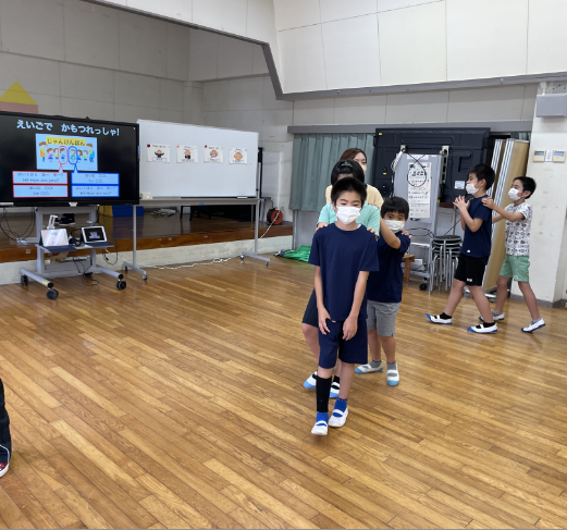 英語で 「How are you?」と尋ねられたら「I’m ◯◯」と答えたり、「Hello」などの挨拶を動画を見て模倣したりしながら楽しく学習に取り組みました。また、「幸せならてをたたこう」の英語バージョンの曲に合わせて体を動かしたり、じゃんけんゲームや色ビンゴをしたりしながら英語に触れ、友達と一緒に楽しく学ぶことができました。