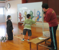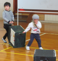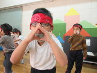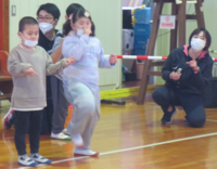 「わくわく どきどき おばけわーるど!!」おばけをテーマに、「わくわく」グループは、的当てや箱積みリレー、文字並べ替え、「どきどき」グループは、サーキットやクイズに取り組みました。最後は、全員でエアロビクスやおばけダンスを踊って盛り上がりました。