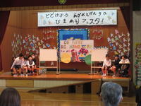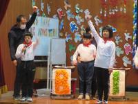 「ブレーメンの音楽隊」の話をベースとした「ひまわり音楽隊」の劇に挑戦しました。体育や算数、国語、音楽、生活単元学習で扱った磁石と電気などを盛り込み、学習成果を存分に発揮する劇を披露しました。色んな動物に扮した可愛らしい子供たちの頑張りに、会場から温かい拍手が送られました。