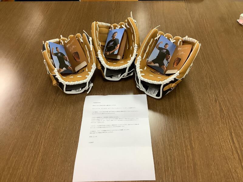 米大リーグ、ドジャーズの大谷翔平選手より、サイン入り子ども用グラブが3個届きました。(右利き用2個・左利き用1個。)