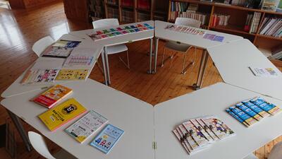 備え付けの本棚やテーブルにパンフレットなどを並べてあります。
