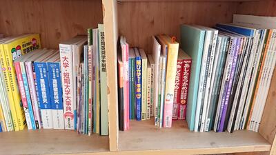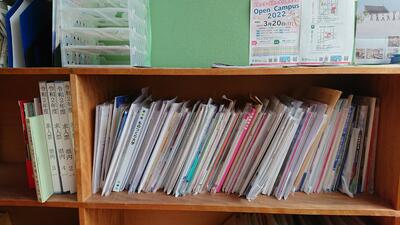 3年生が実際に使用する書類は置いていません(1階の進路指導室にあります)が、オープンキャンパスの案内や、菊高の先輩の写真付きコメントや、県外の下宿・アパートなどの情報、1年前の求人票、などなど、1,2年生の内から知っておくとよい資料が揃っています。