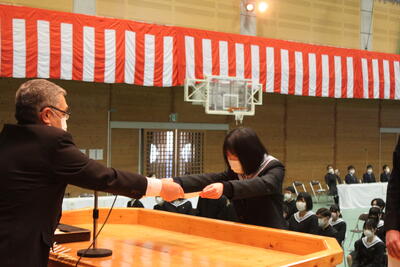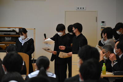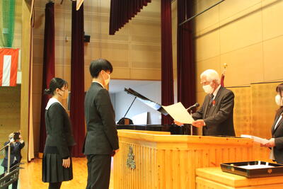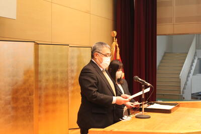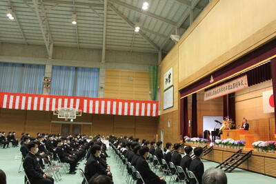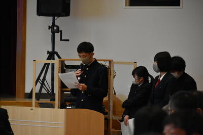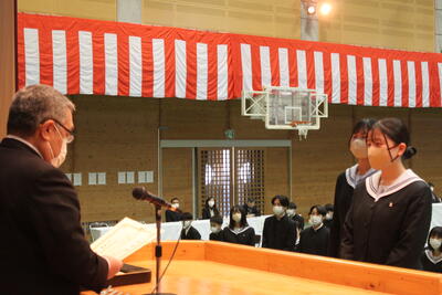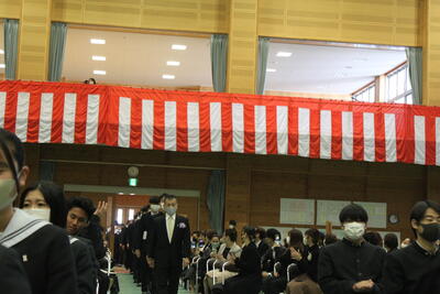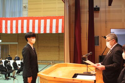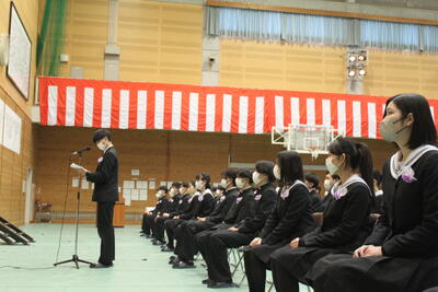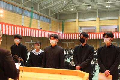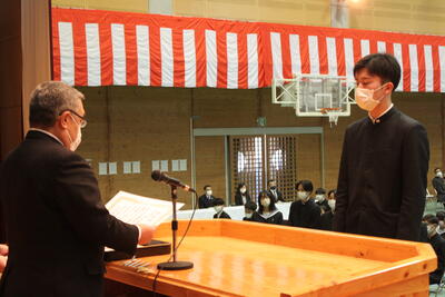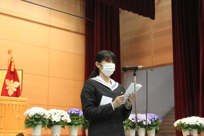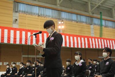 私は式辞の中で、「高校時代にこの未知なるウイルスという逆境を乗り越え、これまでの当たり前が当たり前ではなかったことや不自由さの中で感じることができた『ありがたさ』や『感謝の気持ち』などを実感することができた皆さんには前途洋々たる素晴らしい未来が待っていると確信している。」と述べました。