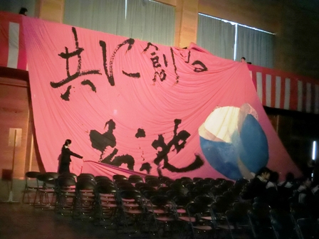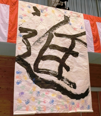 生徒会テーマ「進」をアレンジした手形入りの書がお披露目されました。