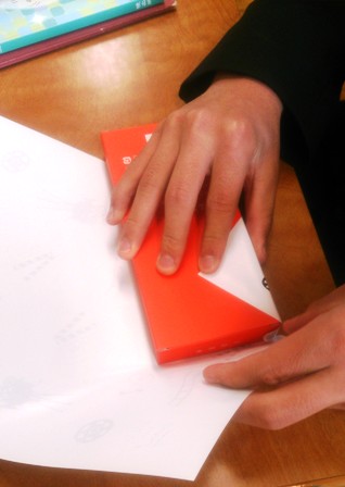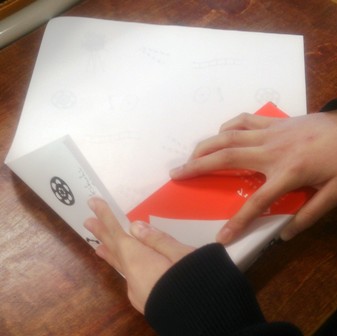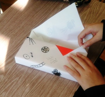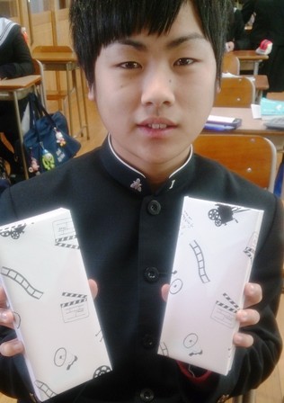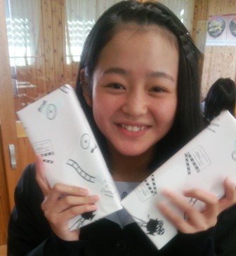 2年5組の迫さんです。 映画祭関連商品を袋詰めしました。