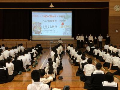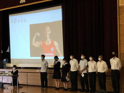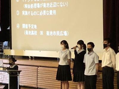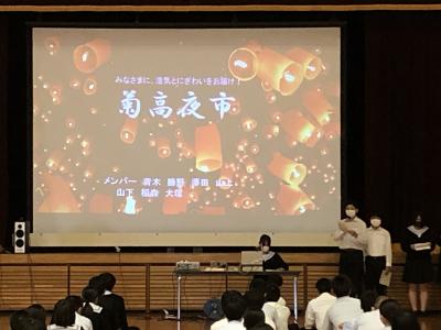 実行委員長3年5組山下華蓮さん、スクール婚活から3年5組岡﨑青空くん、キクザニアから3年4組菊川千那さん、販売実習の商品開発から3年5組満田帆奈美さんから「菊高ジャック」の紹介を行いました。