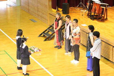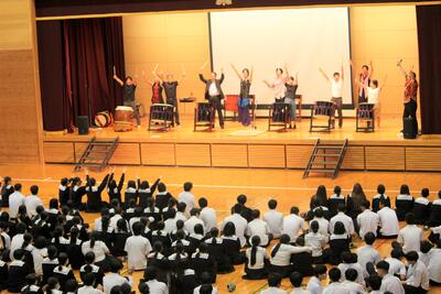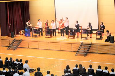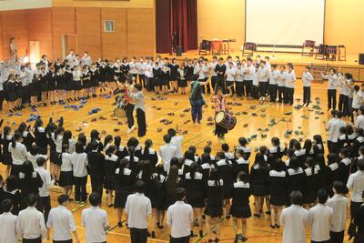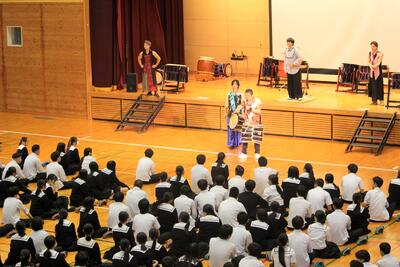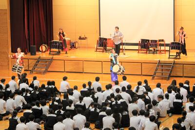 令和6年10月23日、芸術鑑賞会を本校体育館で実施しました。 この会は、生の芸術鑑賞を通して、生徒たちの感性を磨き 心豊かな人間性を育成することを目的に、3年に1回開催しています。 今回の演目は、「ヒダノ修一!スーパーリズミックス」 太鼓とタップダンスを融合した迫力あるステージでした。 生徒や職員の体験コーナーでは、与えられたリズムで太鼓をたたき 演奏する側と聴く側とが一体となりました。 アンコールでは、メンバーを輪で囲み一緒に演奏を愉しみました。