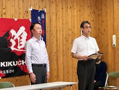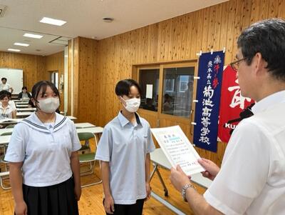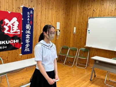 その後、各教室にいる全員が起立をして生徒会長からの「菊高生徒十則」、校歌を聞きました。